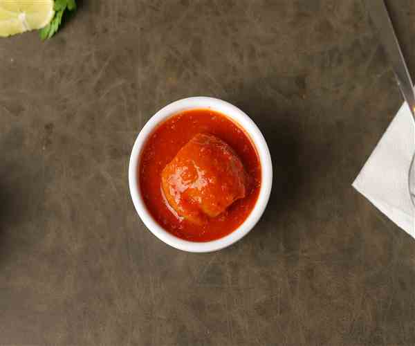 Shrimp glazed in tomato sauce mixed with spices, served with bread.
